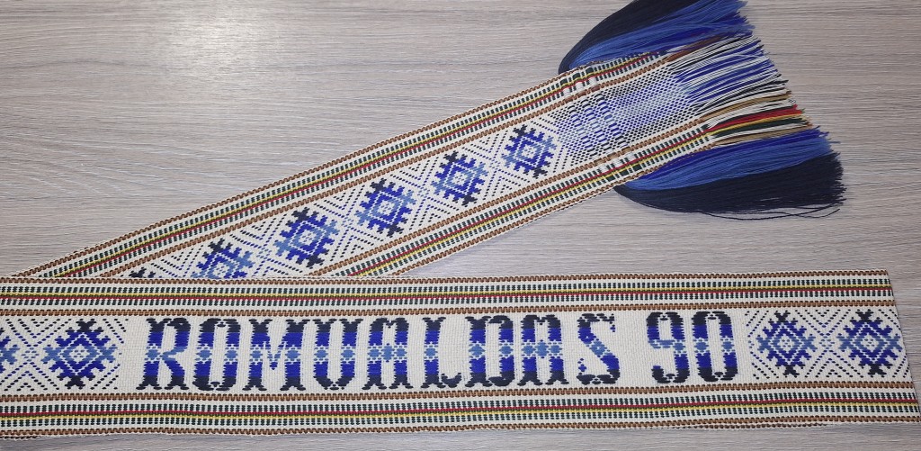 Šioje nuotraukoje – ypatinga austa juosta, sukurta kaip šiltas sveikinimas Moldovos antstolių organizacijai 15 metų sukakties proga nuo Lietuvos antstolių rūmų. Joje susipina ne tik raidės ir raštai, bet ir nuoširdūs linkėjimai. Juostos kutai Lietuvos ir -